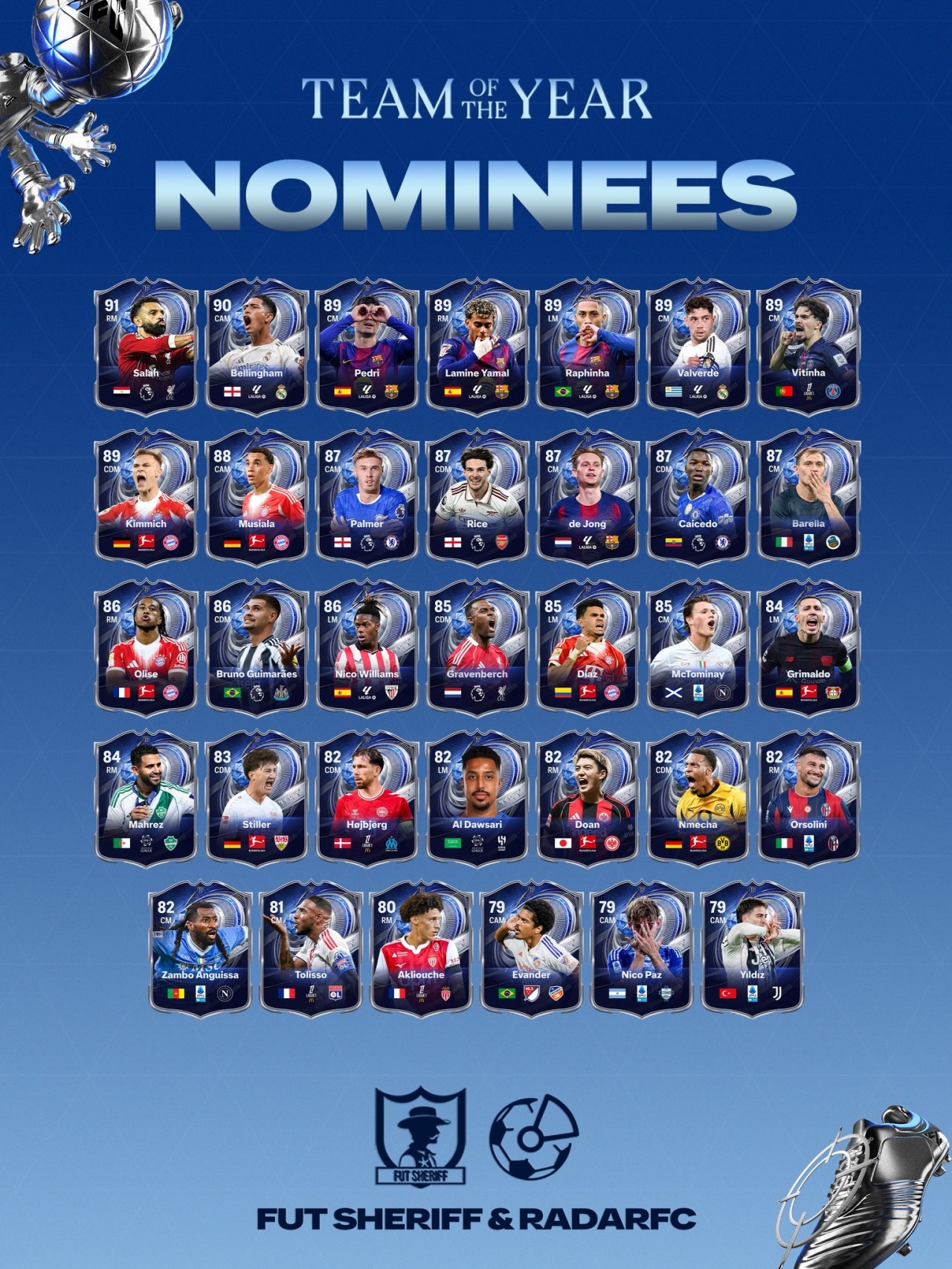 星空体育-EAFC26年度蓝候选:27名前锋含梅罗,亚马尔拉菲萨拉赫被列为中场